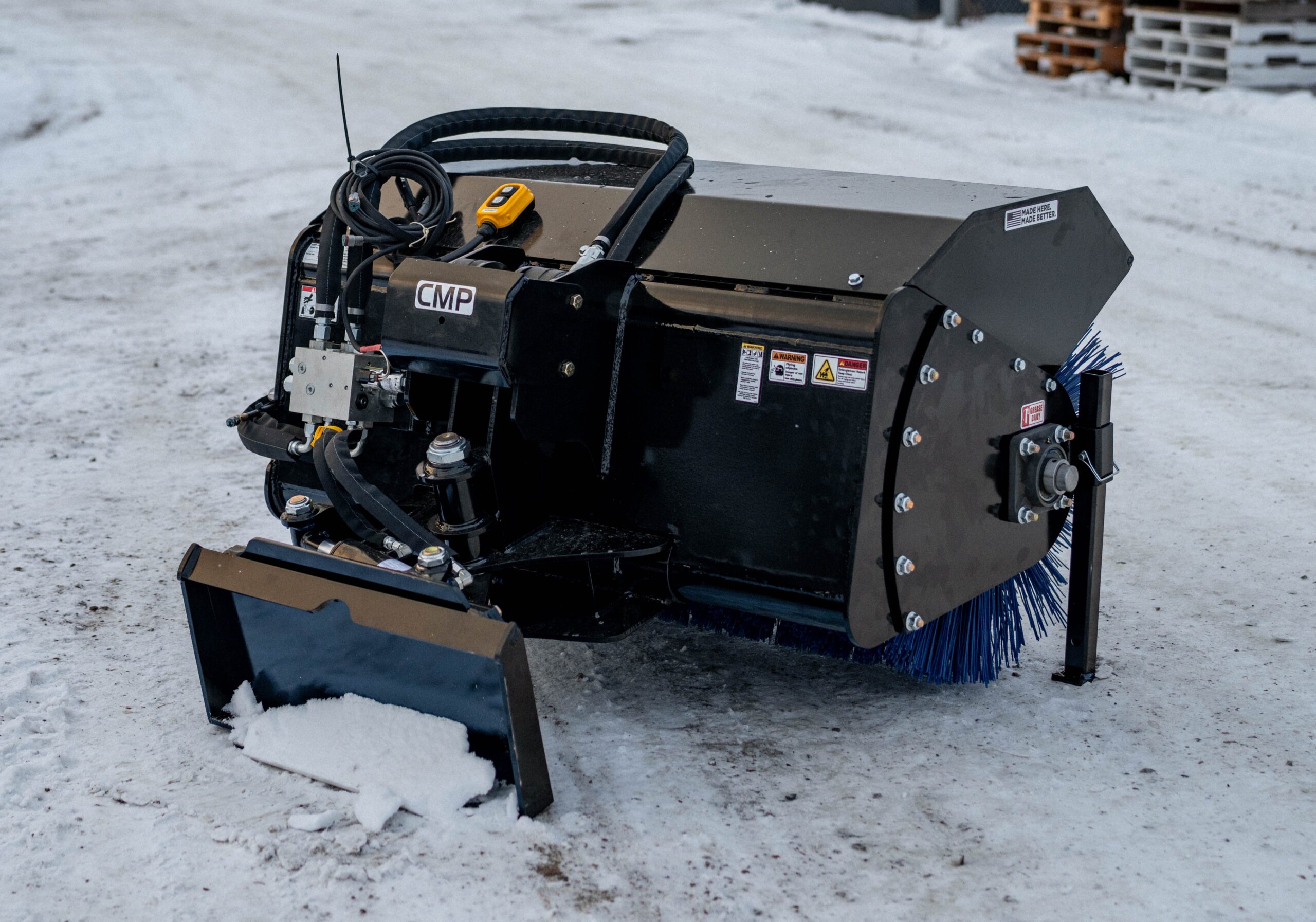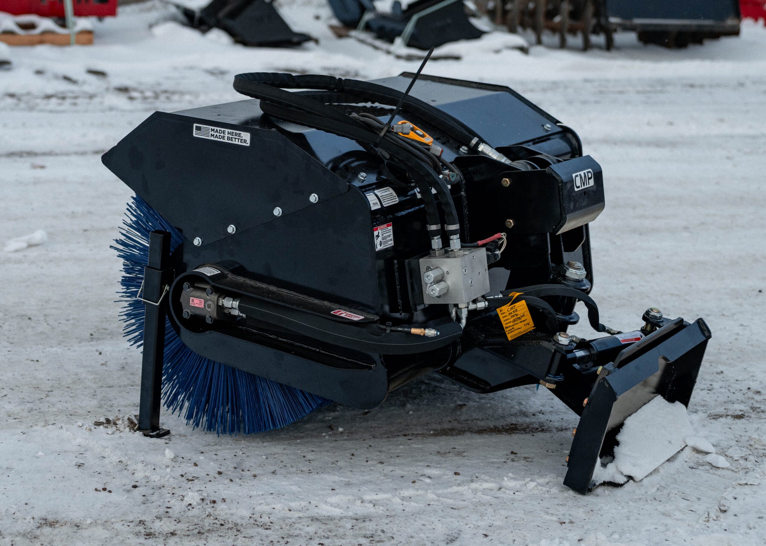 Our mini skid angle broom gives you ultimate flexibility for all your sweeping needs. Sidewalks, driveways, or jobsites covered in dust or snow can be quickly cleared with your mini skid. The drum can be steel or poly brush and hydraulic tilt allows efficient material placement.